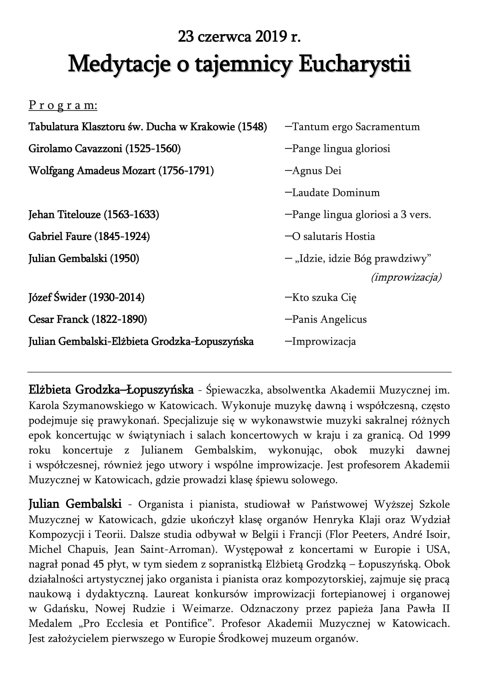 W niedzielę 23 czerwca miał miejsce koncert zatytułowany MEDYTACJE O TAJEMNICY EUCHARYSTII. Muzyczne rozważanie poprowadzili Elżbieta Grodzka-Łopuszyńska (sopran) i Julian Gembalski (organy).