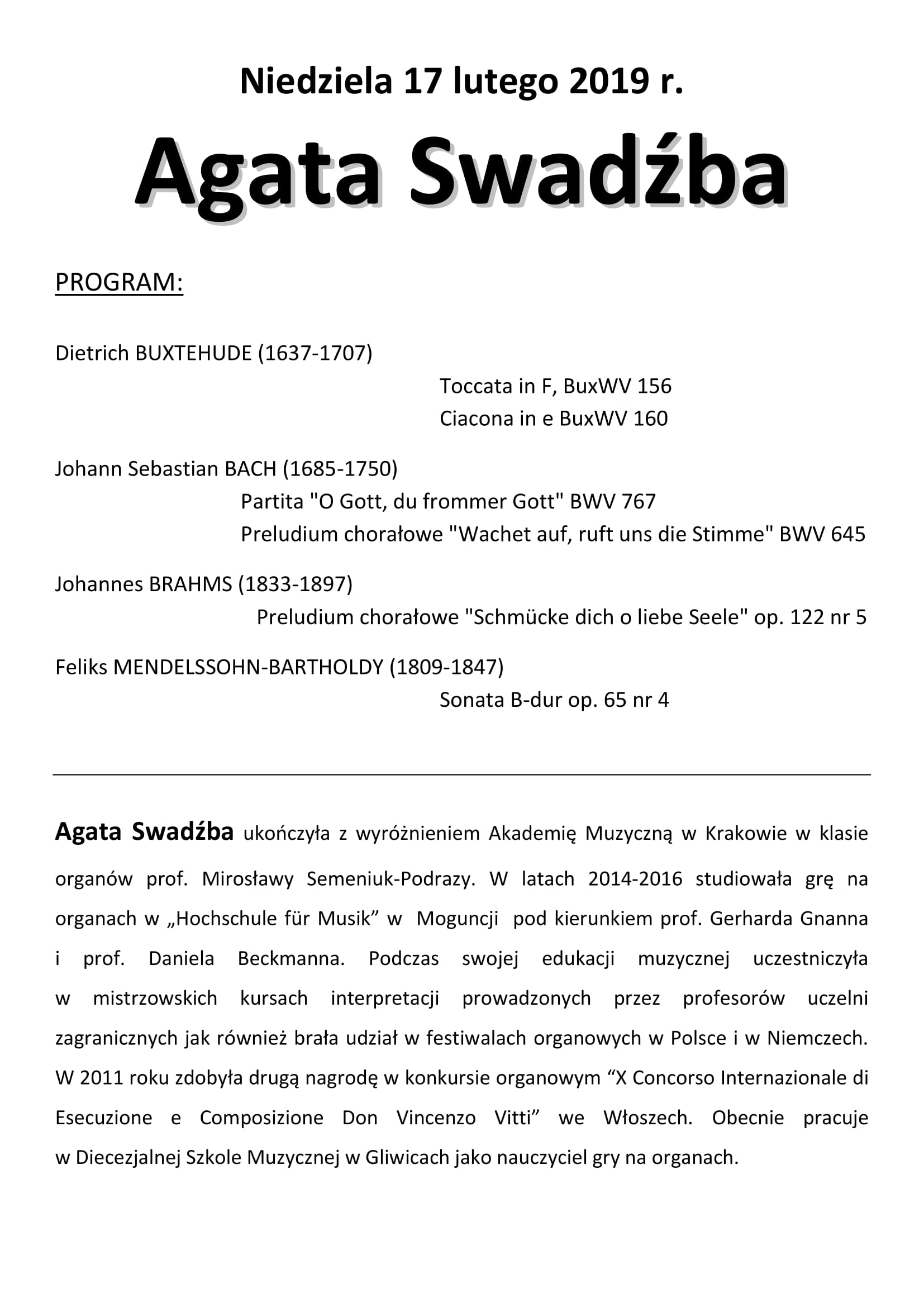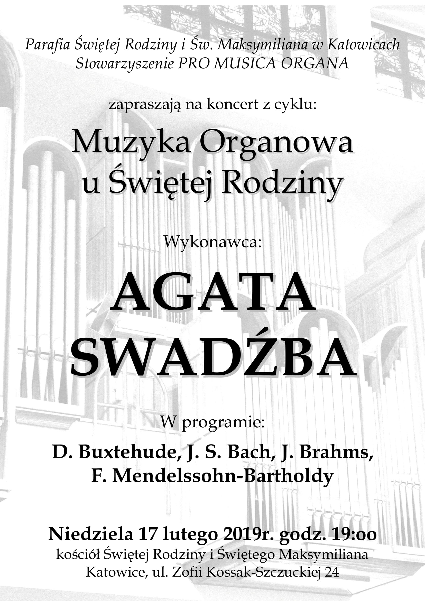 Serdecznie dziękujemy Pani Agacie Swadźbie za uświetnienie swoim występem naszego Festiwalu "Muzyka Organowa u Świętej Rodziny". Wykonawczyni recitalu, który odbył się 17 lutego br. w naszym kościele zabrała słuchaczy we wspaniałą podróż po niemieckiej muzyce organowej baroku i romantyzmu. Życzymy Pani Agacie wielu sukcesów i liczymy na kolejne miłe spotkania u Świętej Rodziny.